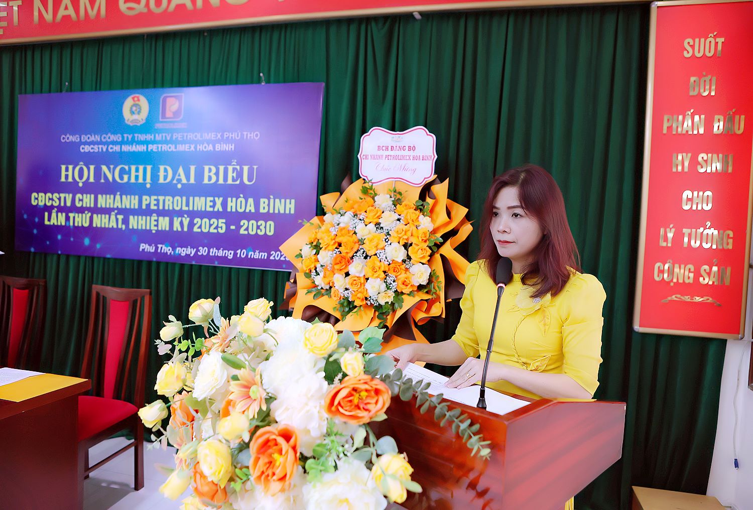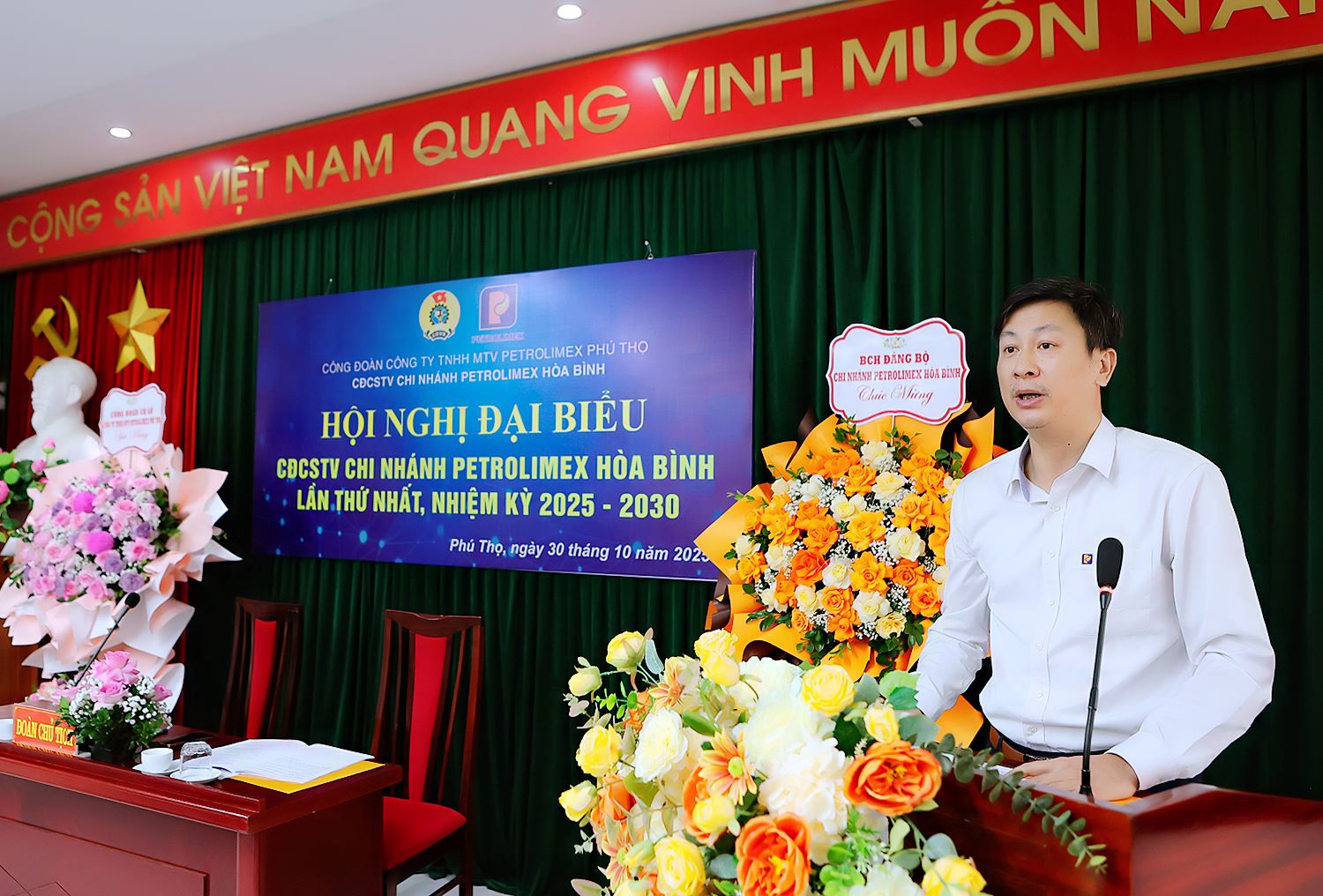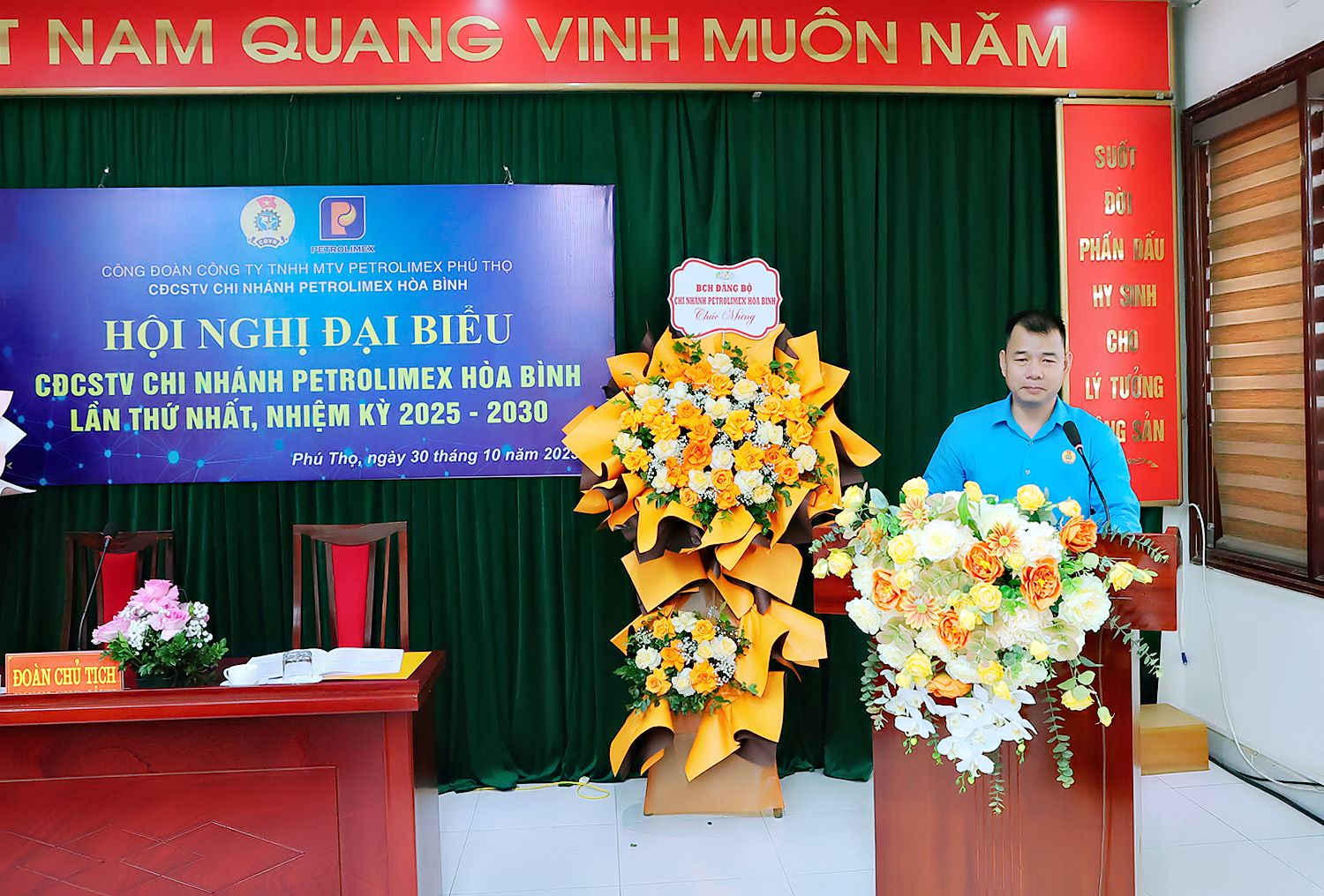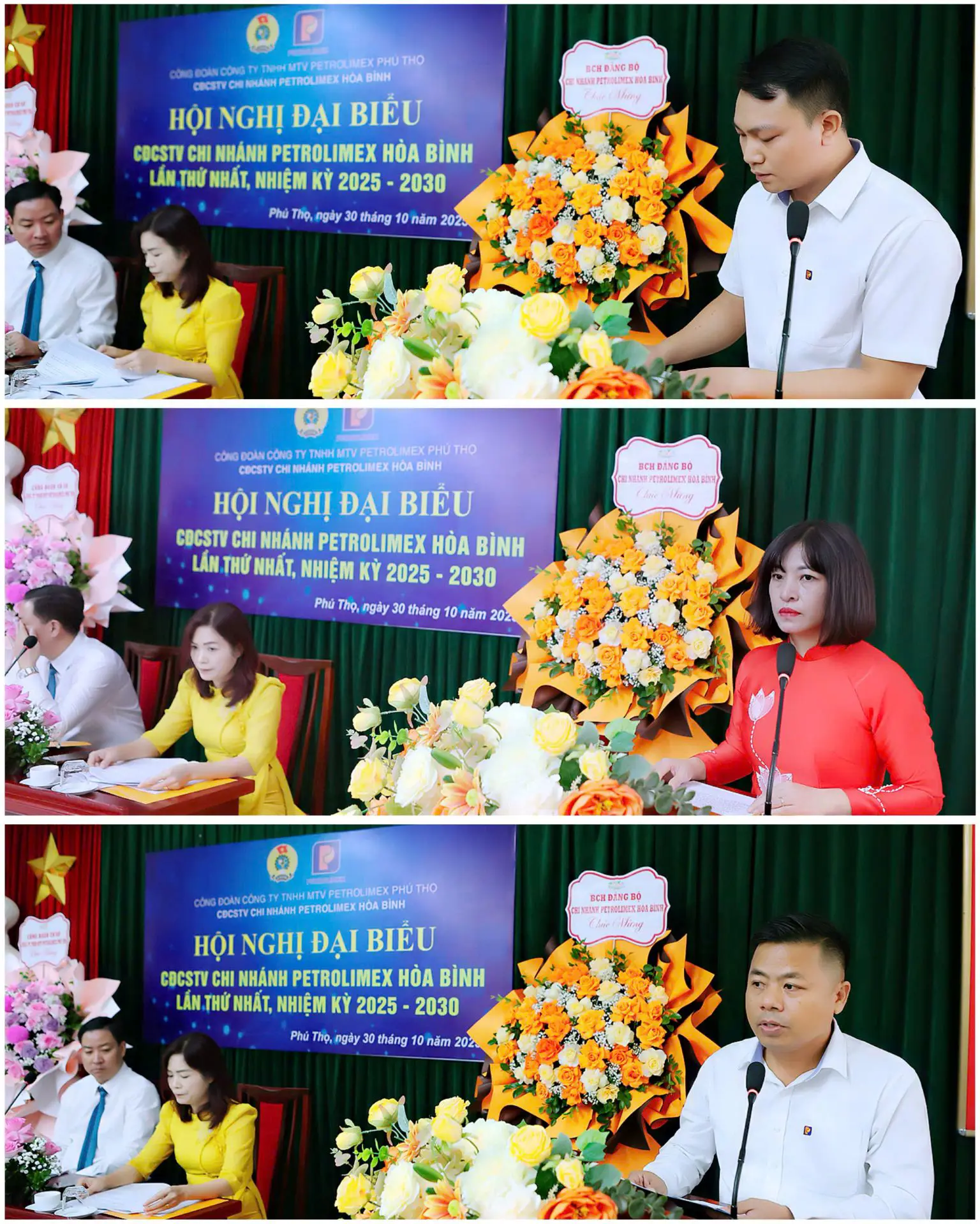 Phát biểu chỉ đạo tại Hội nghị, Chủ tịch CĐCS Công ty Lại Xuân Cường và Bí thư Đảng ủy Chi nhánh Lê Văn Học đã đánh giá cao và biểu dương, ghi nhận những kết quả Công đoàn CSTV CNXD Hòa Bình đã đạt được trong nhiệm kỳ 2023 – 2028. Đồng thời cũng mong muốn trong thời gian tới, Công đoàn CSTV Chi nhánh tiếp tục làm tốt công tác giáo dục chính trị, tư tưởng cho đoàn viên thực hiện nghiêm nội quy lao động; quán triệt các Nghị quyết của Đảng, chính sách pháp luật của Nhà nước, các nhiệm vụ trọng tâm của Tập đoàn, Công ty; phát huy vai trò của Công đoàn trong công tác chăm lo, bảo vệ quyền hợp pháp chính đáng của người lao động; tổ chức tốt các phong trào thi đua yêu nước, đẩy mạnh phong trào thi đua trong sản xuất kinh doanh và thực hiện có hiệu quả các hoạt động từ thiện, an sinh xã hội, đền ơn đáp nghĩa... nhằm tôn vinh thêm hình ảnh, thương hiệu Petrolimex trên địa bàn.