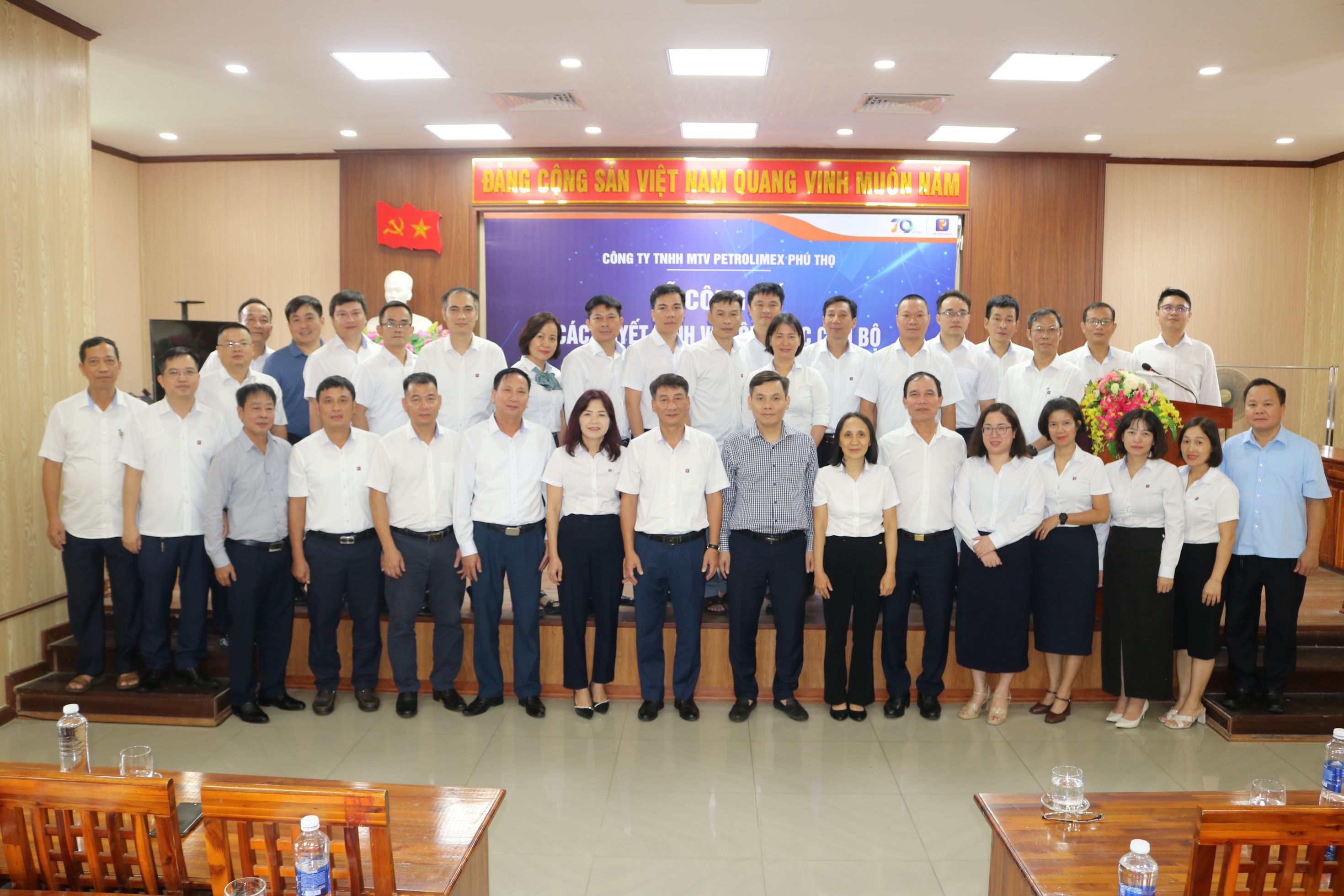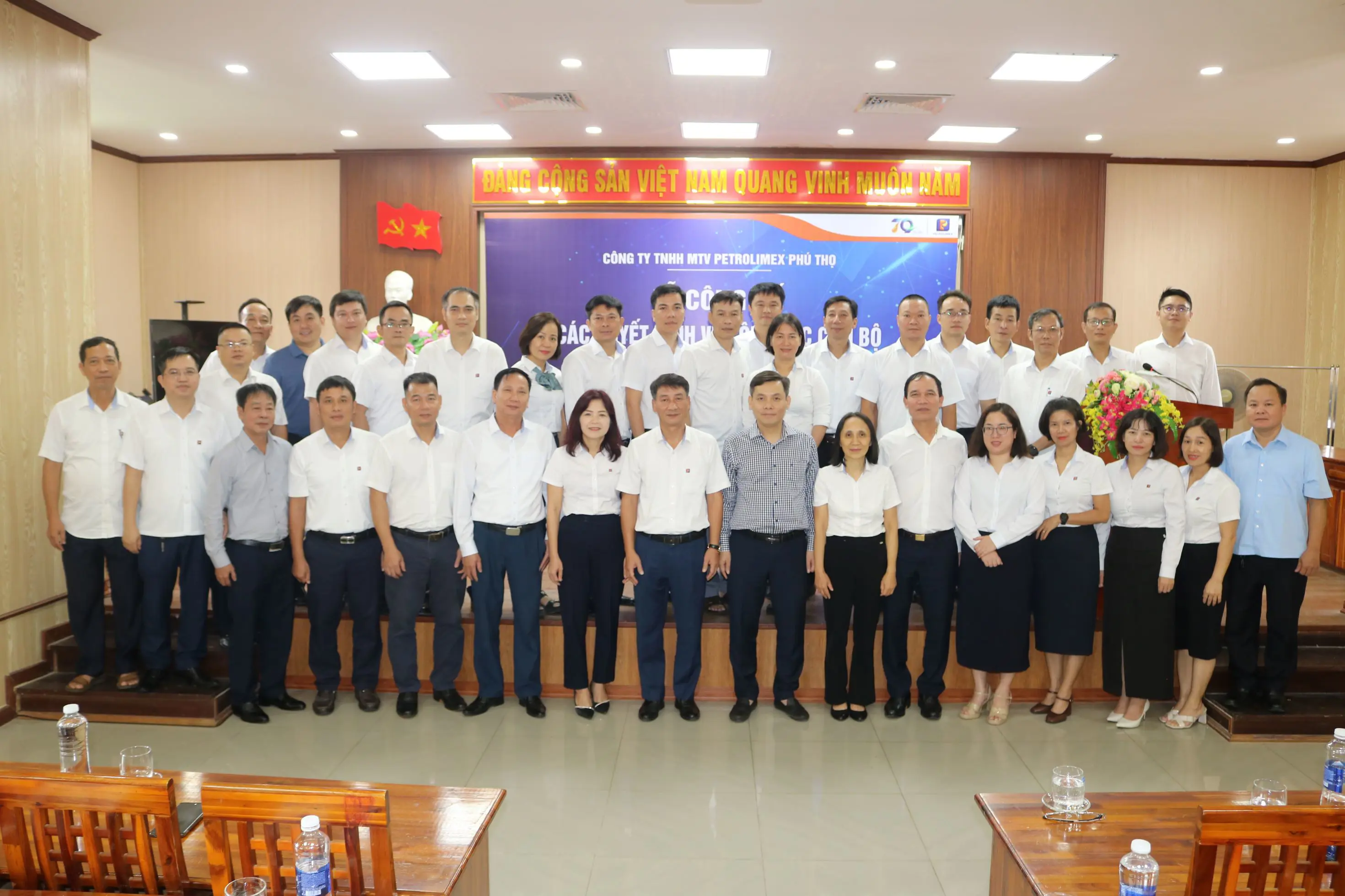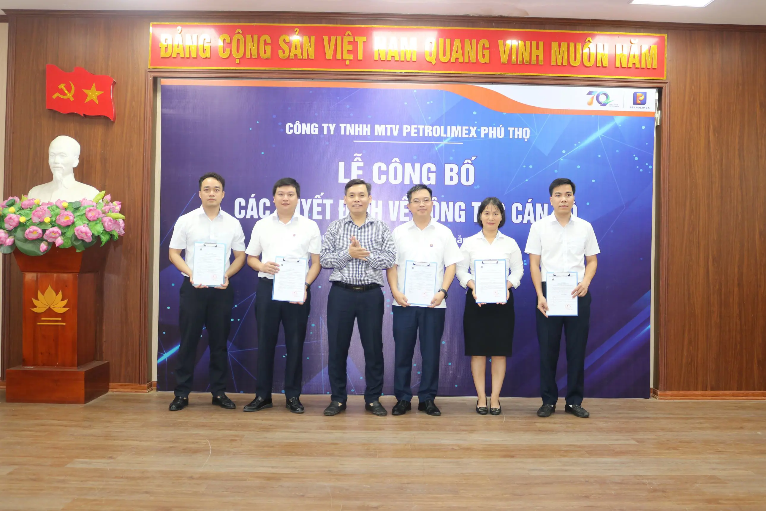 Tại buổi lễ Trưởng phòng TCNS Công ty Nguyễn Ngọc Tuấn đã thông báo các Quyết định: Quyết định: 1118/PLX-QĐ-HĐQT về việc ông Lê Văn Đạo, thôi kiêm nhiệm chức vụ Giám đốc Công ty, tiếp tục giữ chức vụ Chủ tịch Công ty; Quyết định: 1130/PLX-QĐ-HĐQT về việc điều động ông Ngô Minh Tú, Chủ tịch Công ty TNHH MTV Xăng dầu Vĩnh Phúc giữ chức vụ Giám đốc Công ty TNHH MTV Petrolimex Phú Thọ; Quyết định: 1131/PLX-QĐ-HĐQT về việc điều động ông Lê Văn Vinh, Giám đốc Công ty TNHH MTV Xăng dầu Vĩnh Phúc giữ chức vụ Phó Giám đốc Công ty TNHH MTV Petrolimex Phú Thọ; Quyết định: 1132/PLX-QĐ-HĐQT về việc điều động ông Vũ Việt Hưng, Phó Giám đốc Công ty TNHH MTV Xăng dầu Vĩnh Phúc giữ chức vụ Phó Giám đốc Chi nhánh Petrolimex Vĩnh Phúc; Quyết định: 1016/PLX-QĐ-HĐQT về việc điều động ông Phạm Huy Thành, Phó Giám đốc Công ty TNHH MTV Xăng dầu Vĩnh Phúc giữ chức vụ Phó Giám đốc Công ty TNHH MTV Petrolimex Phú Thọ trực tiếp làm Giám đốc Chi nhánh Petrolimex Vĩnh Phúc; Quyết định số 899/PLX-QĐ-HĐQT về việc điều động ông Lê Văn Học, Giám đốc Chi nhánh Xăng dầu Hòa bình thuộc Công ty Xăng dầu Hà Sơn Bình giữ chức vụ Giám đốc Chi nhánh Petrolimex Hòa bình; Quyết định số 1220/PLX-QĐ-HĐQT về việc bổ nhiệm ông Phạm Chí Hiếu, Kế toán trưởng Công ty TNHH MTV Petrolimex Phú Thọ giữ chức vụ Trưởng ban kiểm soát Công ty.